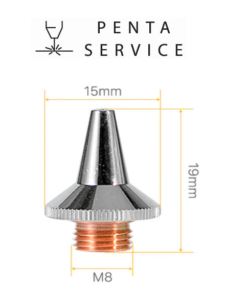 Сопло PENTA SERVICE, диаметром 15 мм, имеет резьбу M8 и диаметр отверстия 2,5 мм, произведено из меди с соблюдением всех необходимых стандартов качества, технических и геометрических параметров изделий данного типа. В результате применения, сопло гарантирует сохранение расчётных параметров в течение длительного времени и обеспечивает высокую мощность работы оборудования лазерной резки.