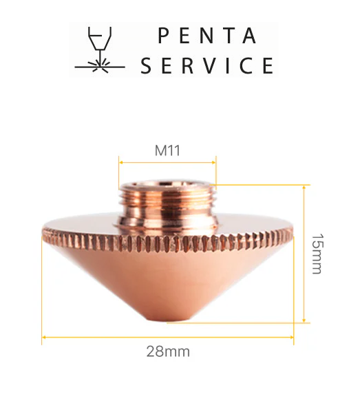 Сопло PENTA SERVICE высотой 15 мм, диаметром 28 мм, имеет диаметр отверстия 2,0 мм и резьбу М11, произведено из меди с соблюдением всех необходимых стандартов качества, технических и геометрических параметров изделий данного типа. В результате применения, сопло гарантирует сохранение расчётных параметров в течение длительного времени и обеспечивает высокую мощность работы оборудования лазерной резки.